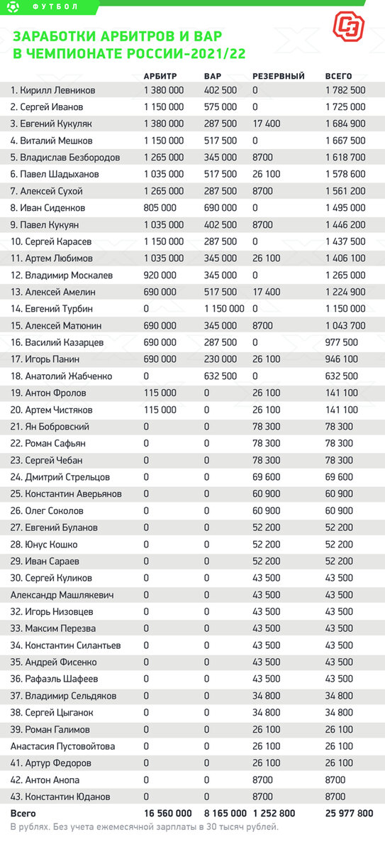 Общая сумма гонораров, которые нужно выплатить судьям, ассистентам, видеоарбитрам и их помощникам по итогам первой части Тинькофф чемпионата России-2021/22, составила 46 072 800рублей. По заработкам лидируют Кирилл Левников, Сергей Иванов и Евгений Кукуляк. В их тени Сергей Карасев. Но это впечатление обманчиво — он пропустил несколько туров чемпионата из-за международных турниров, которые с лихвой покрыли его финансовые потери в России.