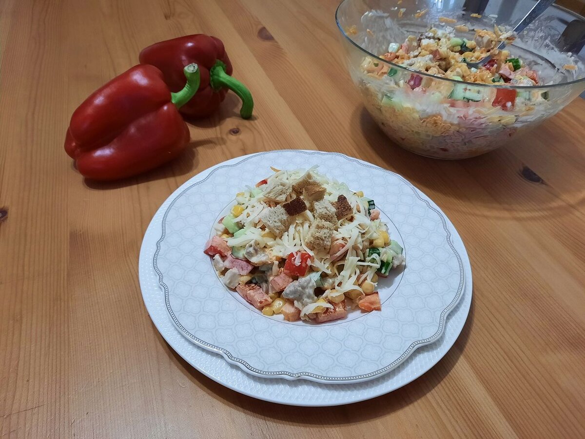 Интересный рецепт яркого салата с курочкой. Мои гости съедают его первым