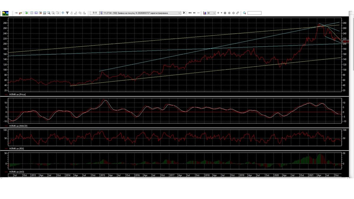 Начиная с июня акции компании Новоли́пецкий металлурги́ческий комбина́т (НЛМК) начиная с июня 2021 года. Постепенно понижает свои уровни, сейчас находится в коридоре 190-220, такое понижение связано с дополнительными выплатами в бюджет страны по постановлению Правительства РФ. Отсюда следует понижение размера выплат дивидендов своим акционерам, плохая экономическая обстановка внутри страны и на международных рынках. По техническому анализу в декабре хорошего отскока в акциях Новоли́пецкий металлурги́ческий комбина́т (НЛМК). Пока не намечается, это хорошо просматривается на месячном, недельном графике, даже выплаты дивидендов не помогает сформировать приличный отскок, чтобы закрыть окно на свечном графике на уровне 220. Единственное, что сможет быки сделать до конца декабря закрыть окно на свечном графике. При этом прохождение линии сопротивления не планируется, потому что много проблем будет, после нового года у компании. Также надо учитывать, что медведи могут и не дать закрыть окно н