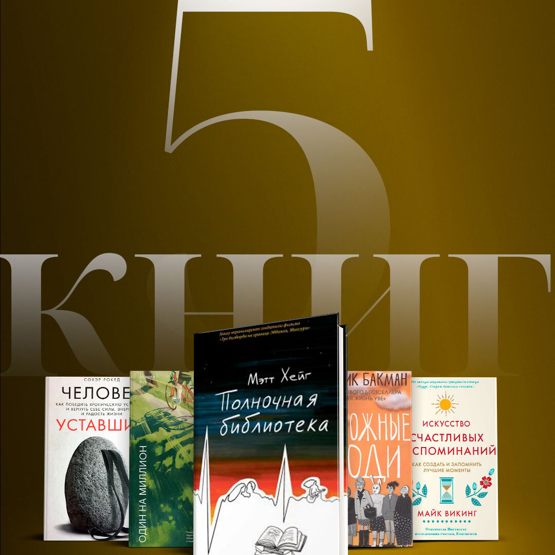 «Полночная библиотека» Мэтт Хейг Действие романа разворачивается в библиотеке содержащей бесконечное количество книг, каждая из которых — история другой реальности. Героиня может изменить жизнь, но сначала нужно разобраться, что делает жизнь достойной и как выбрать правильный путь. «Один на миллион» Моника Вуд Книга, которая вдохновит переосмыслить свою жизнь. История о мальчике, который ухаживал за 104-летней старушкой, а она делилась с ним бесконечными историями из своей жизни. «Тревожные люди» Фредрик Бакман Комедия о преступлении, которое никогда не совершалось и о восьми чрезвычайно встревоженных незнакомцах, которые обнаруживают, что у них больше общего, чем они могли себе представить. «Искусство счастливых воспоминаний. Как создать и запомнить лучшие моменты» Майк Викинг Автор раскрывает секреты человеческой памяти и показывает на конкретных примерах, как лучше сохранить самые приятные и яркие дни в своей жизни, чтобы иметь возможность вернуться к ним в любой момент. «Человек ус