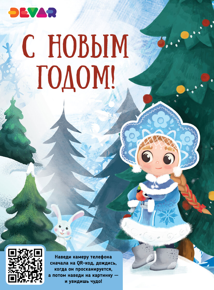 Мы в DEVAR подготовили для вас красочную картинку, которую вы можете распечатать как плакат и украсить помещение, либо отправить как виртуальную открытку другу. И это точно будет оригинальным презентом: достаточно отсканировать QR код и перейти по ссылке в браузере - и Снегурочка оживёт в интерьерах вашей локации! Она двигается, поёт песню и дарит ощущение праздника в буднях! А ещё с ней можно сфотографироваться. Иллюстрация оживает благодаря нашей платформе для создания дополненной реальности в web - MyWebAR. В начале года мы начали оживлять обложки наших книг, а теперь не можем остановиться - и оживляем всё, что угодно! Ведь это очень удобно: не нужно устанавливать приложения или программы, а оживлять 3D модели в AR можно с разных устройств и даже в разных странах. Пользуйтесь на здоро