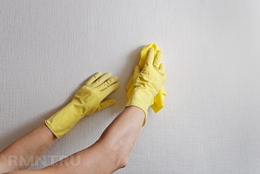 Протирать покрытие лучше тщательно отжатой тряпкой. Избыток влаги может привести к отклеиванию полотна от стены. Кроме того, неравномерное высыхание спровоцирует появление некрасивых полос и разводов.
