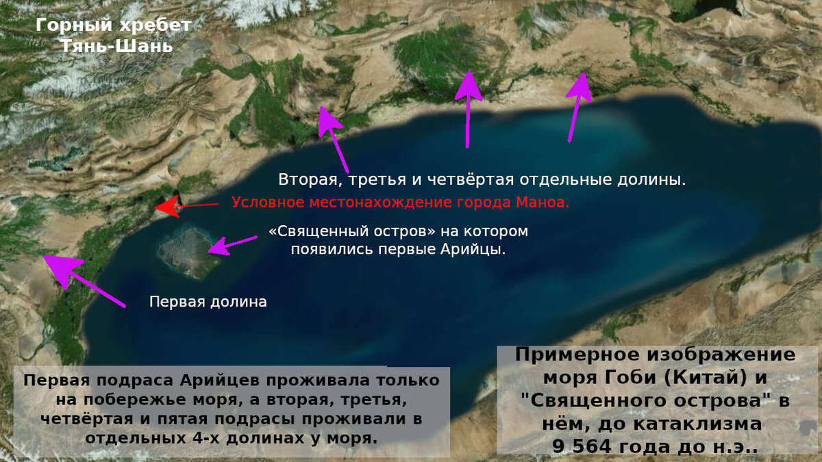 Примерно 22 000 лет до н.э. началась подготовка к созданию четвёртой подрасы Арийцев в Гобийском море. В то время на месте современной пустыни Гоби в Китае находилось море Гоби с расположенным на нём «Священным островом». Первая подраса Арийцев в это время ещё проживала на территории всего побережья Гобийского моря, кроме отдельных обособленных долин. Их столицей продолжал оставаться прекраснейший город Маноа. Остатки второй подрасы Арийцев и остатки третьей подрасы Арийцев, которые не иммигрировали в своё время на запад Евразии, остались проживать в двух из четырёх обособленных долин на побережье моря Гоби. Соответственно, две обособленные долины ещё оставались девственными и нетронутыми.
