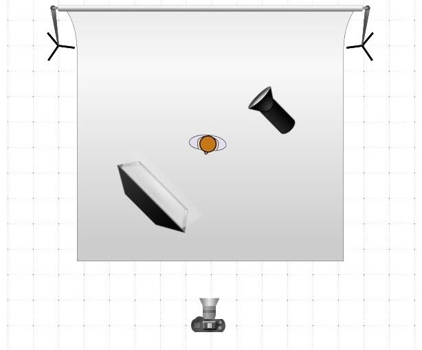 Рассмотрим все это на практическом примере. Мы хотим снять поясной портрет девушки с одним источником света. Мы хотим использовать мягкий свет с плавными переходами от света к тени на конечном изображении, поэтому выбираем источник мягкого света - софтбокс. Размер этого софтбокса должен быть больше снимаемого объекта, здесь все индивидуально, но в целом прямоугольного софтбокса размером 90х60 см нам будет достаточно. Расположение источника: выбираем классическое передне-боковое расположение, это даст нам хороший светотеневой рисунок и плавный градиент на противоположной от источника стороне. Высота источника: выбираем классические 45 градусов по отношению к объекту съемки.