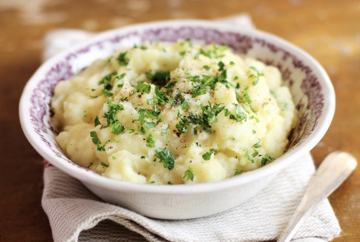 Как готовить? 1. Духовку разогреть до 350 градусов. 2. Разрезать головку чеснока пополам сверху, сбрызнуть оливковым маслом, приправить по вкусу солью и перцем. Оберните алюминиевой фольгой и запекайте около часа, пока чеснок не станет мягким. 3. Сжимая каждый зубчик выдавите чеснок. Отложите в сторону. 4. Выложите картофель в кастрюлю, залейте водой, приправьте солью и перцем и варите 15-20 минут, пока не станет мягким. 5. Выключите и разомните. Добавьте соль, перец, масло, жирные сливки и жареный чеснок. 6. Используйте миксер до желаемой консистенции. По желанию украсить петрушкой.