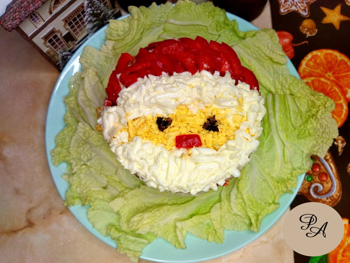 Новогодний салат из индейки: "Дед Мороз". Очень вкусный и нежный.