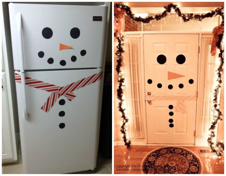 Cнеговик на холодильнике или двери От этого дети точно будут в восторге — быстро, весело и очень просто, ведь с вырезанием крупных деталей справится даже трехлетка. Достаточно вырезать кружочки, нос и шарф из самоклеящейся бумаги, оберточной бумаги или цветного картона и прикрепить их на обычный или двусторонний скотч. Снеговик из носка Вам потребуются: рис, белый носок, пуговицы, бусинки и лоскуты ткани. Из ненужных белых носков получатся вот такие забавные снеговички. Отрежьте мысок у носка, а с другой стороны перевяжите его ниткой. Насыпьте рис, придавая круглую форму, снова перетяните ниткой и насыпьте еще риса, сформировав шар поменьше. Пришейте глаза и нос, сделайте шарф из лоскутка, пришейте пуговицы. А из отрезанной части получится отличная шапочка. Елочки-конфетки Вам понадобятся: трюфельные конфеты или любые другие, зубочистки, скотч, цветная бумага или картон с рисунком. Яркие елочки можно соорудить вместе с малышами для детского праздника или украсить ими праздничный стол.