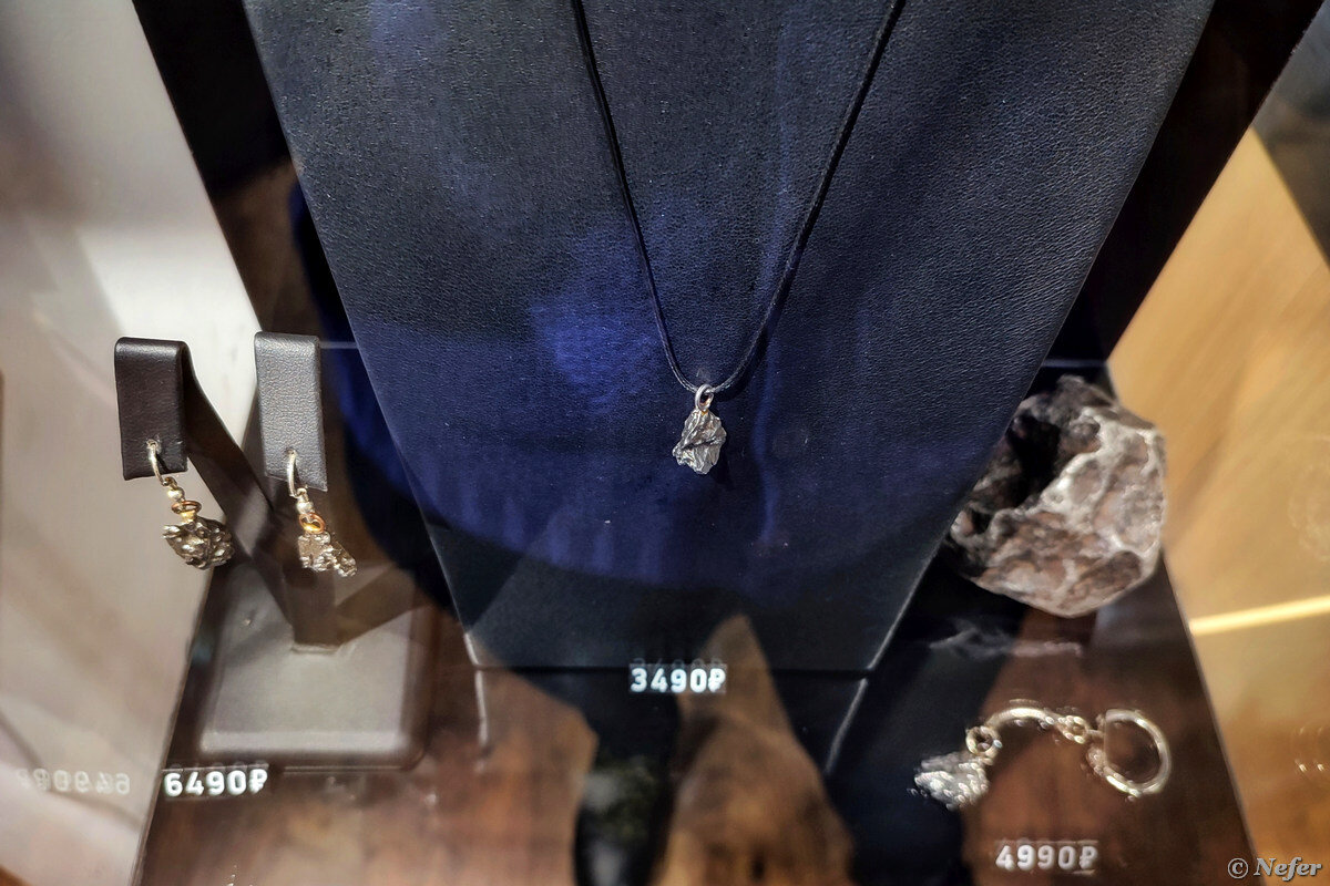 Из серии "Подарок для человека, у которого все есть". Оригинально, впервые такое вижу! Недавно была на Флаконе, там проходил рождественский BAZAR ВОКЗАЛ. Ждала, пока высохнет моя поделка, походила там, погуляла. Наткнулась на указатель, заинтересовалась, потом нашла сам магазин. Посетителей никого, слишком экзотический товар. Фотографировать неудобно, мешают блики в стеклянных витринах, но я старалась. В этой витрине висела табличка "видманштеттенова структура" и объяснялось, что это такое. Сфотографировала, чтобы не забыть термин. Видманштеттенова структура характерна для железных и железокаменных метеоритов. Она проявляется на срезе после травления кислотой. Такая структура образовалась благодаря наслаиванию железа и никеля в космическом пространстве на протяжении многих миллионов лет под воздействием крайне низких температур и давления. Поэтому ее невозможно воссоздать даже в лабораторных условиях. Эта табличка относится к первому кулону, который на заглавной фотографии. Подвеска из