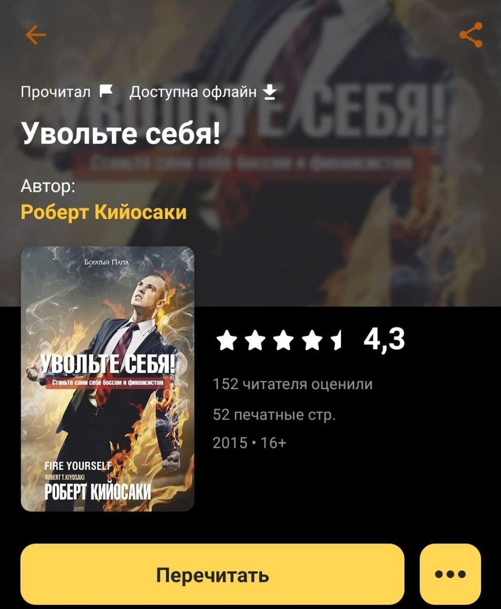 С произведением “Уволь себя” Роберта Кийосаки необходимы быть максимально аккуратным, а то ведь в вашей жизни могут появиться перемены, которых вы не планировали ранее. Ниже перечислю мысли, пришедшие мне в голову после прочтения данной книги: 1. Бизнес может стать бизнесом, ещё до того, как кто-то об этом задумался. 2. Для того, чтобы любой бизнес был успешным, у него должна быть стратегия, а также духовная и деловая миссия. 3. При создании бизнеса первоочередная миссия может быть - заработок. Однако, дальше миссии необходимо трансформироваться или компания погибнет. 4. Позаботьтесь о том, чтобы Вам могли оплачивать товар любым доступным способом. 5. Если вы считаете, что ходите на работу только для того, чтобы прокормить себя, то вам нужно рискнуть и сменить работы. Если нет удовольствия от работы, то у вас нет жизни. 6. Бедные люди не умеют общаться. 7. Все великолепные лидеры - великолепные ораторы. Хочешь стать лидером - стань оратором. То, что я написал в первом абзаце – это