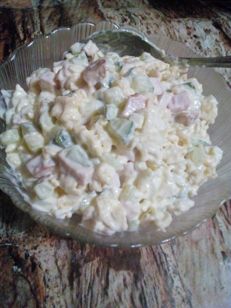 Просто, необычно и вермишель варить не надо. Можно на обед или ужин. Ингредиенты: вермишели Ролтон, яйца, Свежий огурец, Вареная колбаса или копченого окорока, Майонез Способ приготовления: Вермишель мелко поломать. Яйца сварить, охладить, почистить, нарезать кубиком. Колбасу порезать кубиком. Свежий огурец помыть, порезать кубиком. Все компоненты сложить в салатник, заправить майонезом. Оставить на 2 часа, чтобы вермишель набухла. Приятного аппетита. Буду рада видеть Ваш отзыв и Вас моим подписчиком, если понравился рецепт.