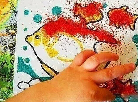Как сделать цветную соль Способ 1: Берем мелки (цветные, известковые или пастельные). На большом листе бумаги рассыпаем соль и катаем мелок по ней. Способ 2: 1. Насыпать в емкость (в пакет) мелкую соль. 2. Гуашь развести в виде жидкой «сметанки» и вылить в соль. 3. Хорошо размешать. 4. Пальцами «вымесить» соль до однородного цвета. 5. Высыпать соль на бумагу для высыхания. 6. Просеять окрашенную соль через сито Для фона можно использовать цветной картон или плотную бумагу. Предварительно на выбранном фоне рисуем композицию или распечатываем на принтере. На фрагменты рисунка последовательно наносим тонким слоем клей ПВА и насыпаем слой цветной соли. Начинать лучше с покрытия темных тонов рисунка, постепенно переходя к более светлым тонам. Стряхиваем лишнее и сушим.