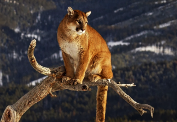 Нашего героя зовут пума, которого также называют кугуаром или горным львом. Это большая хищная кошка чья длина тела доходит до 2 метров, а высота в холке до 90 см, Средняя масса кугуара не превышает 80 кг, но частенько масса некоторых самцов переваливает за 100 кг. Как видите пума заметно мельче тигров и львов, хищная кошка не может похвастаться большими габаритами. Однако суровый нрав пумы с лихвой компенсирует её скромные размеры, пума это очень наглый, самоуверенный и дерзкий зверь. Это самый настоящий отморозок мира диких животных в Южной Америке и юго-восточной части Северной Америки где живёт горный лев, нет ни одного вида животного на которой бы не охотилась пума. Кугуар охотится абсолютно на всё, до чего могут достать его загребущие лапы. Они нападают на оленей, бобров, обезьян и лосей, если представится случай пума не преминут закусить койотом, аллигатором, одиноким волком и лисой. Пумы не испытывают ни малейшей эмпатии к родственным видам, поэтому при случае кугуар съест рыс