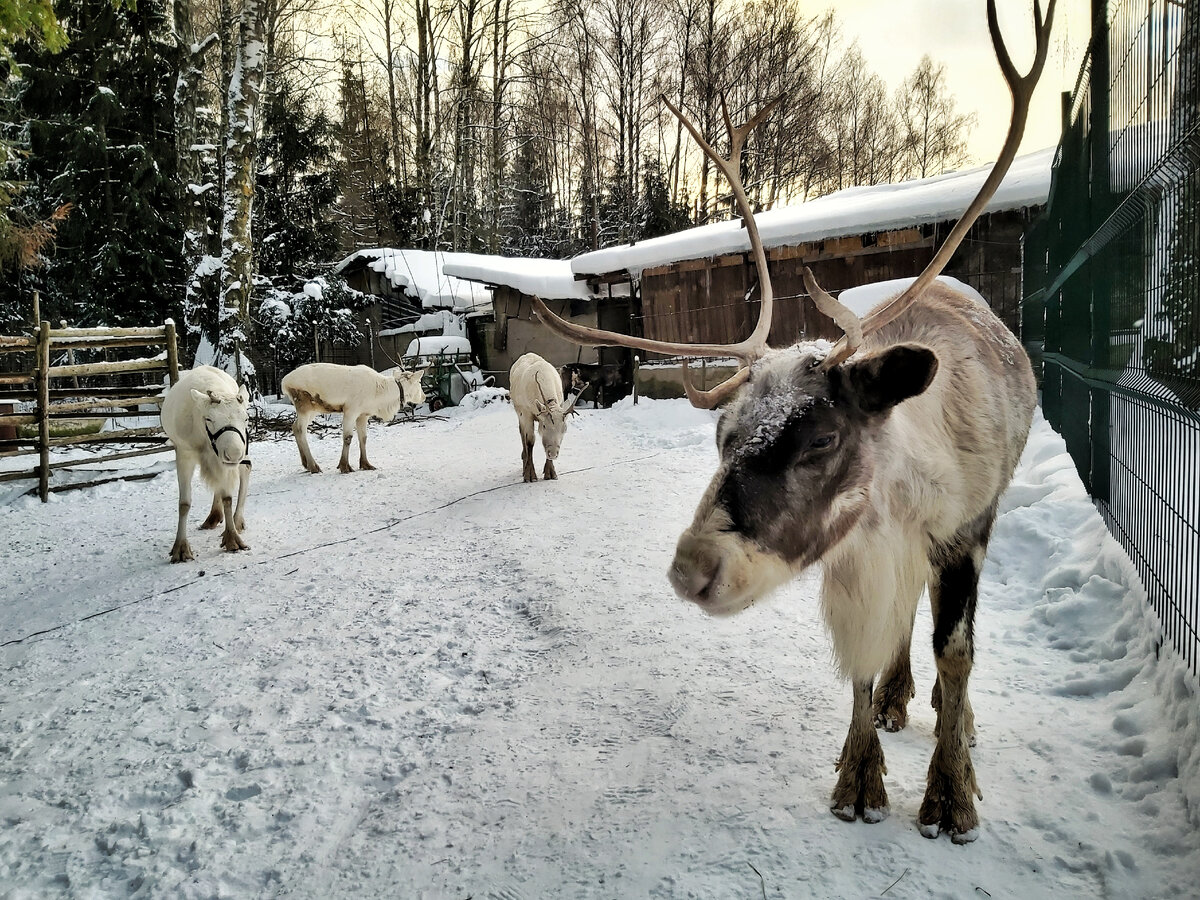 Есть что-то невероятное, когда ты открываешь калитку в парк и тебе навстркчу выходят олени. Никаких клеток, закрытых загонов, надзирателей. Олени совсем не опасны, приручены и, привыкшие к людям, добровольно идут знакомиться с гостями. К ним не страшно отпускать детей, ведь у оленей нет зубов и они не кусаются. Рога, правда, не бутафорские, могут бодаться, но нас не трогалм, хотя мы как раз их трогали, гладили, а Муся пыталась хватать их за рога, хвосты и уши. Я пыталась пресекать ее поползновения, но зазеваться в этом волшебном месте так легко, что иногда ей удавалось кого-нибудь за что-нибудь ухватить. Они, правда, тоже нами не брезговали. Вообще забавно, когда идешь и вдруг тебя кто-то тычет в плечо, оборачиваешься, а тааааам... Через полчаса прыкаешь ходить стадом и, желая бробраться по сугробам к кому-то интересному, опираешься на спины этих добродушных животных, похлопываешь тех, кто заграждает путь, по дороге треплешь парочке оленят ушки (совсем, как собакам), почесываешь, погл