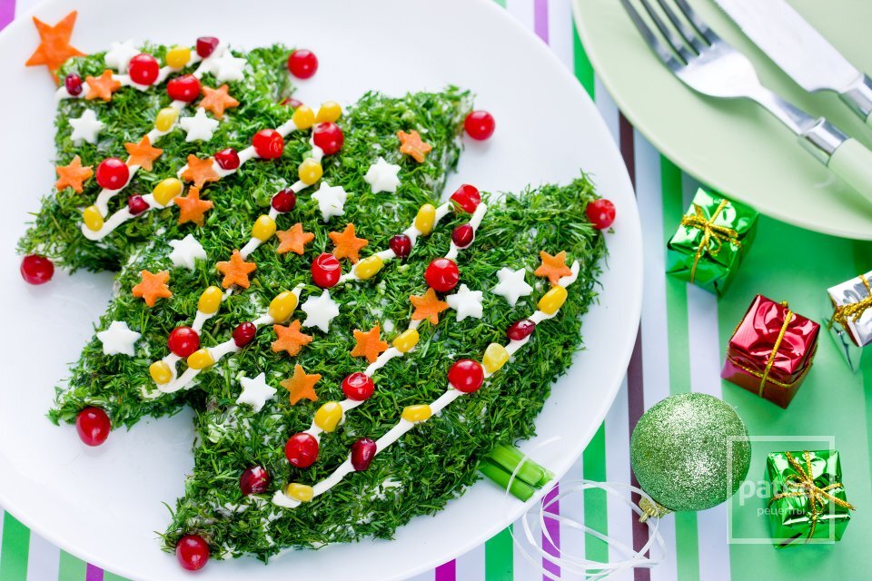 Ингридиенты: 300 гр. консервированные шпрот в масле. 3 средние картофелены 3 маринованных огурца среднего размера. 1 луковица. 1 большая морковь. 4 яйца. 150гр.йогурта без добавок. 1ст.л.дижонской горчицы. 1ст.л.растительного масла для жарки. Для украшения: 20гр.Клюквы. 20гр. Консервированной кукурузы. 20гр.Кондитерского украшения"звёздочки" 100гр.Укропа. 25гр.Майонеза. 1перо зелёного лука. СПОСОБ ПРИГОТОВЛЕНИЯ: 1.Яица отварить в течении 10 минут после закипания воды до готовности. Остудить, очистить. Натереть на мелкой тёрке. Картофель помыть, отварить в кожуре около 30 мин. Остудить, очистить, натереть на крупной тёрке. 2.Лук очистить. Нарезать кубиками. Морковь очистить. Натереть на крупной тёрке. Обжарить лук на подсолнечном масле в течении 2-3 минут, затем добавить морковь и обжаривать ещё 5-7 минут до мягкого состояния. Огурцы натереть на крупной тёрке. Отжать рассол. Укроп помыть, обсудить, мелко нарезать. Смешать йогурт с горчицей. 3.Выкладывать салат слоями, форми