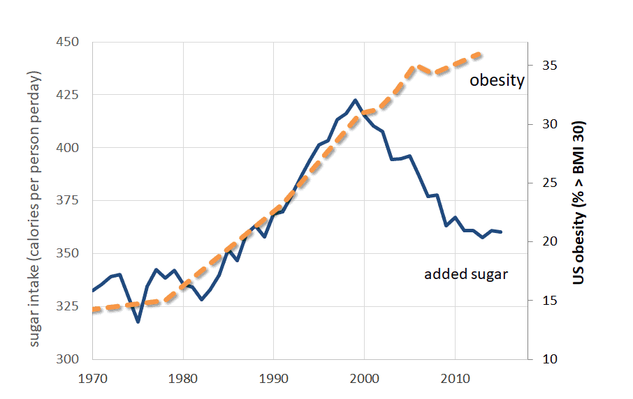 В процессе создания пищевых ароматизаторов и искусственных подсластителей производители продуктов питания не используют сахар для придания продуктам определенного вкуса, вместо этого они используют дешевую муку и добавленные масла. Именно поэтому подобные графики со снижением потребления сахара есть по многим странам. Однако каждый раз, несмотря на снижение уровня потребления сахара, ожирение никуда не девается, и даже наоборот (что было видно на одном из приведенных ранее графиков). Поэтому само представление о сахаре, как о белом яде и основной причине ожирения, является некорректным.