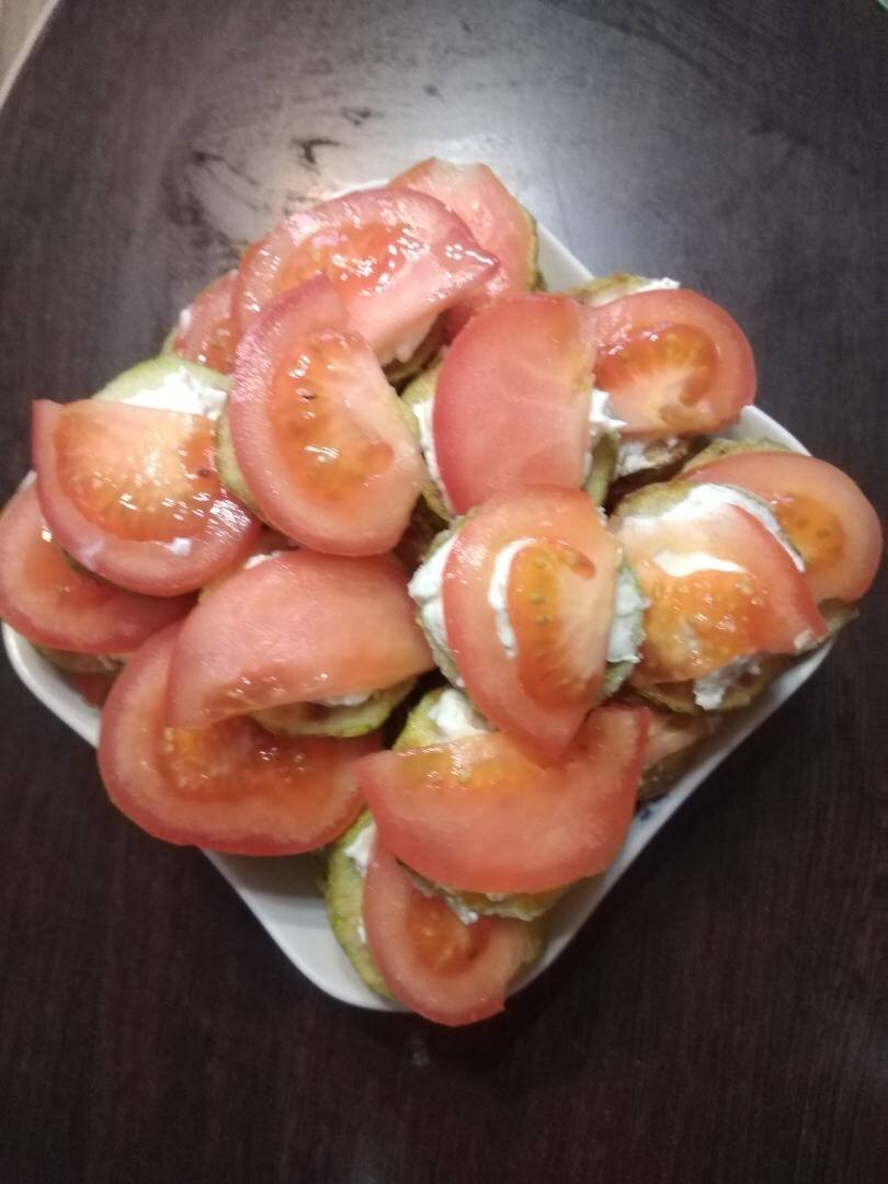 На каждый кружок кабачка выложить 1 ч ложку рикотты и накрыть кружочком помидора. Выложить стопкой в салатник и подавать. Можно украсить зеленью.