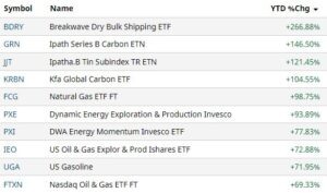 Именно здесь выигрывают такие продукты, как iPath Global Carbon ETN (GRN) (рост на 146,5%), KraneShares Global Carbon ETF (KRBN) (рост на 104,55%).