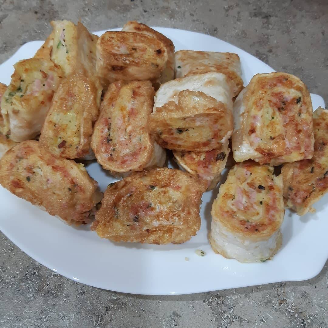 Сворачиваю лаваш в рулет и нарезаю на кусочки.