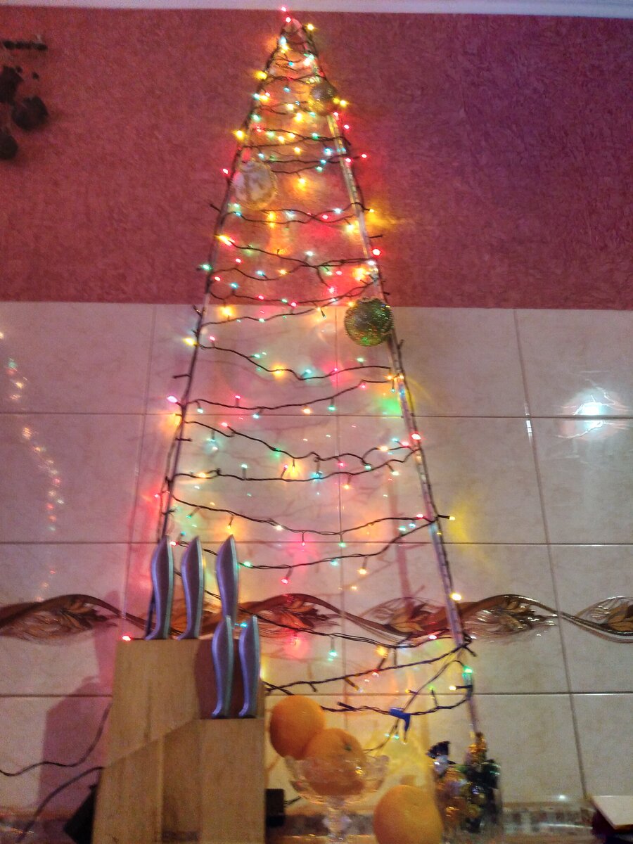 Потребуется гирлянда, проволока, плоскогубцы, скотч, игрушки елочные, 30 минут времени! Такую ёлочку можно на любую стеночку. Она легкая и мобильная. Захотели перенести в другую комнату - это легко сделать. потребуется любой жесткий каркас определяемся с размером жесткой проволочкой закрепляем с двух сторон чтобы елочка держала форму можно взять любую не громоздкую легкую гирлянду. У меня было 2 гирлянды. тонкой полоской бумажного скотча закрепляем гирлянду на макушке и затем начинаем аккуратно обматывать нашу елочку гирляндой Из кусочков проволоки в нескольких местах можно сделать крепеж чтобы гирлянда на скользила. Можно вместо проволочки использовать скотч. внизу делаем опору у елочки просто загнув каркас так как наша елочка будет стоять на кухонном столе, то в жанре новогоднего настроения для эстетики я "спрятала" опоры в стакан с конфетами намотали гирлянды, повесили елочные игрушки и вуаля! Ёлочка, зажгись! И ёлочки живы и настроения от проявления творческой энергии в совмес
