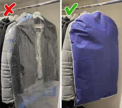 Для хранения сезонной одежды приходится прибегать к использованию чехлов и коробок. Вот только то, что отлично работает в случае с краткосрочным хранением, например пластиковые пакеты, в которых вещи отдают из химчистки, для долгосрочного пребывания вовсе не подходит.