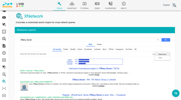 В этом материале рассказываем о наиболее используемых нами инструментах и расширениях для браузера. Они пригодятся не только журналистам, но и любому пользователю, который хочет упростить себе поиск и проверку данных. Это те инструменты, которые мы используем практически ежедневно и убедились в качестве их работы. InVid Начнём с самого продвинутого. Мощное решение от WeVerify, которое помогает не только провести глубокую проверку фото и видео, но и собирать информацию в «Твиттере». Для опытного пользователя оно может заменить и сервисы проверки метаданных, и сервисы анализа фото на наличие правок. Вы можете провести покадровую проверку видео из Facebook, YouTube или Твиттера (или загрузить присланный файл для проверки). Кроме того этот сервис поможет распознать надписи на фото, ИИ справляется с этим порой лучше, чем человек. Этот инструмент обновляется регулярно, одно из последних улучшений — возможность провести кроссплатформенный поиск по ключевым словам (включая поиск по картинкам и