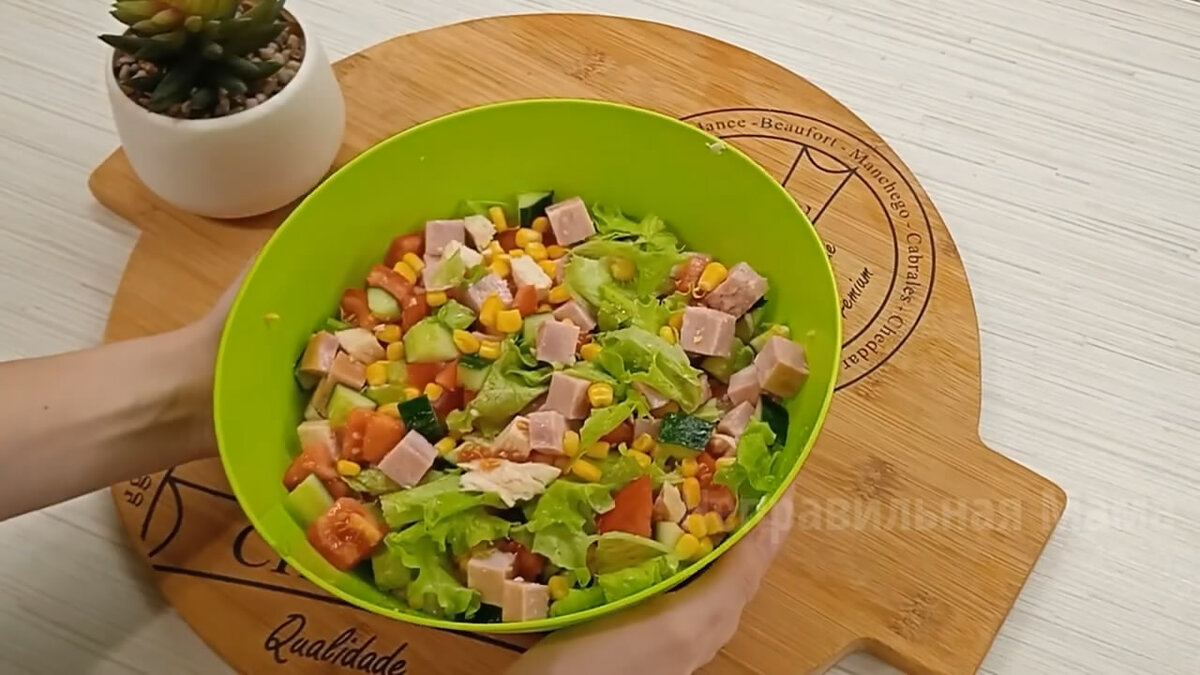 Однажды мы с супругом гуляли по магазинам и были ну очень голодные. Не долго думая, мы заскочили в "Ленту" и выбрали себе по салатику. Я взяла с крабовыми палочками, а муж выбрал очень интересный салат, с не менее интересным названием "Грация". Честно признаться, я никогда раньше не пробовала салаты, где несколько видов мяса. А в этом салате есть и мясо куриного филе, и еще ветчина. Они отлично сочетаются со свежими овощами и сухариками. Благодаря этому салат настолько вкусный и сытный, что стал любимым салатом моего мужа. Теперь я на каждый праздник обязательно готовлю "Грацию", чтобы удивить гостей. И сегодня я поделюсь с вами рецептом, как можно легко приготовить такой салатик. Для него нам понадобится: Я специально не указываю точное количество ингредиентов, чтобы вы могли положить их больше или меньше по своему вкусу. В приготовлении всё предельно просто: нарезаем все ингредиенты (кроме кукурузы и сухариков, конечно) крупными кубиками. Именно благодаря крупной нарезке раскрывается