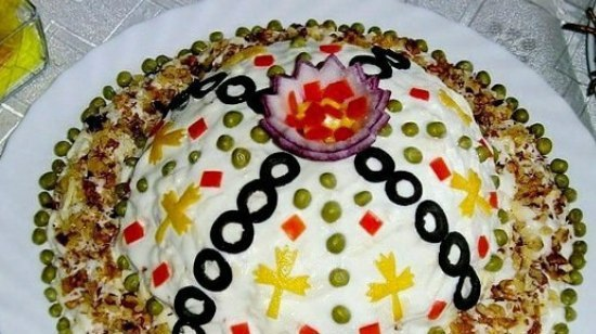 Отварите курицу в слегка подсоленной воде. Варить нужно примерно минут 20. Затем мелко порежьте курицу или помните ее вилкой. Переложите курицу в блюдо (в котором будете подавать салат) и хорошенько утрамбуйте её. Грибочки можно взять маринованные, а можно — свежие, но тогда обжарьте их на сковороде. Порежьте грибы (если крупные), выложите их на курицу. Не перемешивайте, т.к. салат должен быть слоеным. Поверх грибов выложите корейскую морковку. Её вы можете приготовить сами, а можете купить в магазине уже готовую. Если морковь слишком длинная, можно её чуть-чуть порезать. Отварите яйца в крутую. Натрите их на крупной тёрке и выложите поверх моркови. Полейте салат майонезом, равномерно распределите его по всей площади салата. Украсьте салат по вашему желанию, на новый год лучше выбрать новогодний принт. Для украшения можете использовать любимые овощи, также хорошо смотрятся и кушаются маслины и орехи.