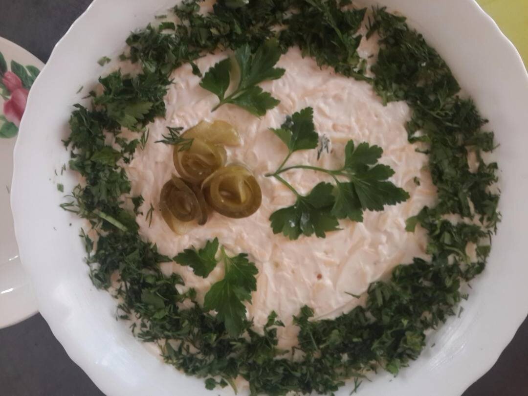 Ингредиенты: куриной печени, соленых огурчика, крупных луковицы, крупных моркови, яйца, сыра, укроп, чеснока, майонез Способ приготовления: 1 слой - отварная печень (на крупной терке), 2 слой-огурчики на крупной терке, 3 слой-морковь (на крупной терке), обжаренная с луком, посыпать слой чесноком(через пресс), 4 слой -яйца (на крупной терке), 5 слой - посыпать сыром и по кругу -зеленью. Между слоями сделать майонезную сеточку.
