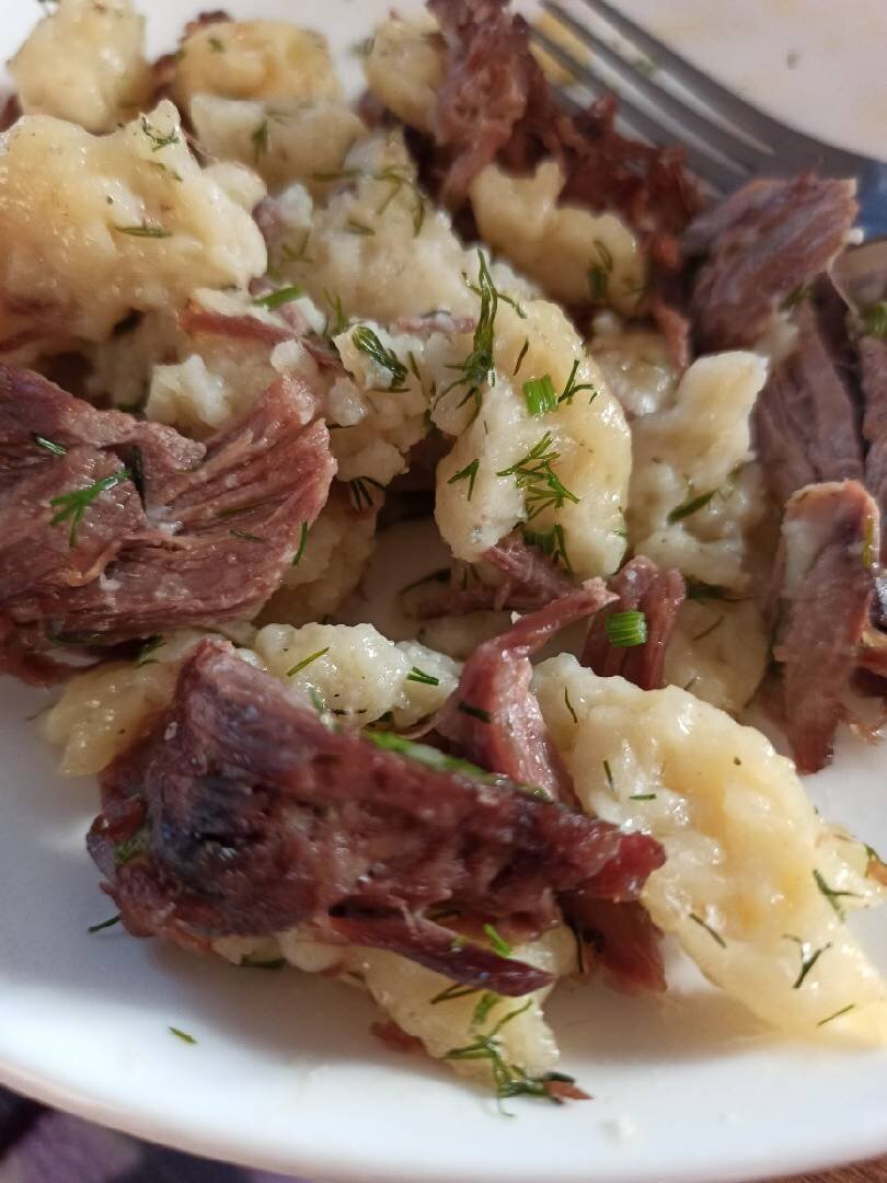 Готовиться легко и нужно очень мало ингредиентов. Ингредиенты: Говядина , Мука, Яйцо, Укроп , Сыр , Вода, Соль, перец, Масло сливочное, Масло растительное Способ приготовления: Мясо помыть, положить в кастрюлю и варить. Когда закипит убрать пену. Варить чем дольше тем мягче будет. В чашку один стакан муки, яйцо, специи по вкусу, соль и воду. Тесто должно быть как густая сметана. Когда свариться мясо вытащить порезать. В той воде где варилось мясо будем варить кусочки теста. Для этого берём разделочную доску, смазываем маслом растительным, тонким слоем выкладываем тесто, нож смазать тоже маслом, чтобы тесто не липло. И ножом отрезая небольшими кусочки прям с досочки скатываем в кастрюлю. Варила в три этапа. Казан разогреть, добавить сливочное масло. Уходит где-то пол упаковки, можно и больше чтобы не сильно липло. Обжариваю Сначала готовое тесто, туда же мясо, мелко порезанную петрушку, соль, перец по вкусу. Выкладываю на тарелку, сверху натёртый сыр. А в стакан налить бульон. Приятного