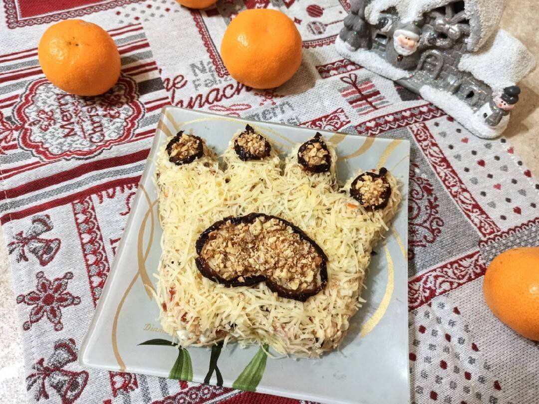 Впереди 2022 год, год Тигра по восточному календарю, и многие хозяйки стараются оформить новогодние блюда в соответствии со знаком грядущего года, чтобы задобрить его покровителя. Мне очень понравилось оформление салата в виде лапы тигра у нашего автора Готовим с Агоньком. И хотя сам рецепт я немного изменила, саму идею подачи решила оставить. @Cooking_Fire , большое спасибо ❤️🙏 #новыйгод Ингредиенты: куриного мяса (100 г копчёного, 50 г отварного), яйца, небольшая луковица, полутвёрдого или твёрдого сыра, чернослив крупный, грецких орехов, майонеза, соль Способ приготовления: Куриное мясо мелко порезать. Яйца отварить, остудить, мелко порезать. Лук порезать мелкими кубиками, залить кипятком на 15 минут, откинуть на сито. Чернослив ошпарить кипятком, 4 штуки мелко порезать, один оставить для оформления салата. Смешать мясо с яйцами, луком и порезанным черносливом, подсолить, заправить майонезом, перемешать. Выложить салат на плоское блюдо в виде лапы тигра. Сыр натереть на мелкой тёрк