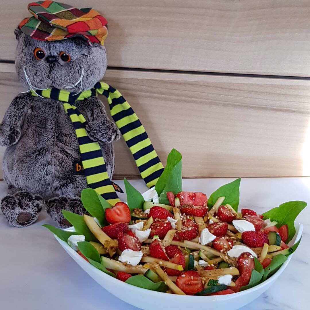 #салат #клубника Ингредиенты: Клубники, Помидор не большой, Огурец, Яблока, Шпинат, Цукини, Мягкий сыр, Соль, перец , Заправка:, Горчицы семечками, Сок половинки апельсина, Оливкового масла, Гранатного/кизилового соуса Способ приготовления: Шпинат моем и раскидываем на тарелке. Сверху режем цукини, помидор, огурец и яблоко. Смешиваем заправку (самая любимая наша заправка для салатов) поливаем салат. Посыпаем солью перцем (очень вкусно с чесночным перцем). Раскладываем порезанную клубнику и любой мягкий сыр (рикотта), можно посыпать кунжутом. Приятного аппетита.