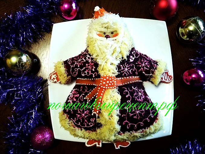 Салат "Сельдь под шубой" является традиционным для новогоднего стола. Это классика, которая из года в год не теряет свою популярность. Предлагаю приготовить новогодний салат с классическим для селёдки под шубой набором продуктов, но оформить его в виде Деда Мороза! Ингредиенты Картофель-7 шт. Селедка слабосоленая-2 шт. Лук-1 шт. Морковь-3 шт. Свекла-3 шт. Майонез-для промазки слоев Лимонный сок-3 ст.л. (чтобы замариновать лук) Сахар-1 ст.л. Для украшения-клюква, гвоздика. Способ приготовления Как подготовить овощи для селедки под шубой? Чтобы салат "Сельдь под шубой" был ярким и насыщенным, нужно, прежде всего правильно приготовить овощи. Для этого мы не будем их варить, а для сохранения всей гаммы вкуса - запечем. Овощи помоем и оботрем бумажным полотенцем. Завернем в фольгу и запечем в духовке при температуре 200º С до готовности, примерно в течение часа. Если нож легко входит в овощ-то все готово. Почистим. Они будут лучше чиститься еще горячими. Лук мелко покрошим. Теперь надо ег
