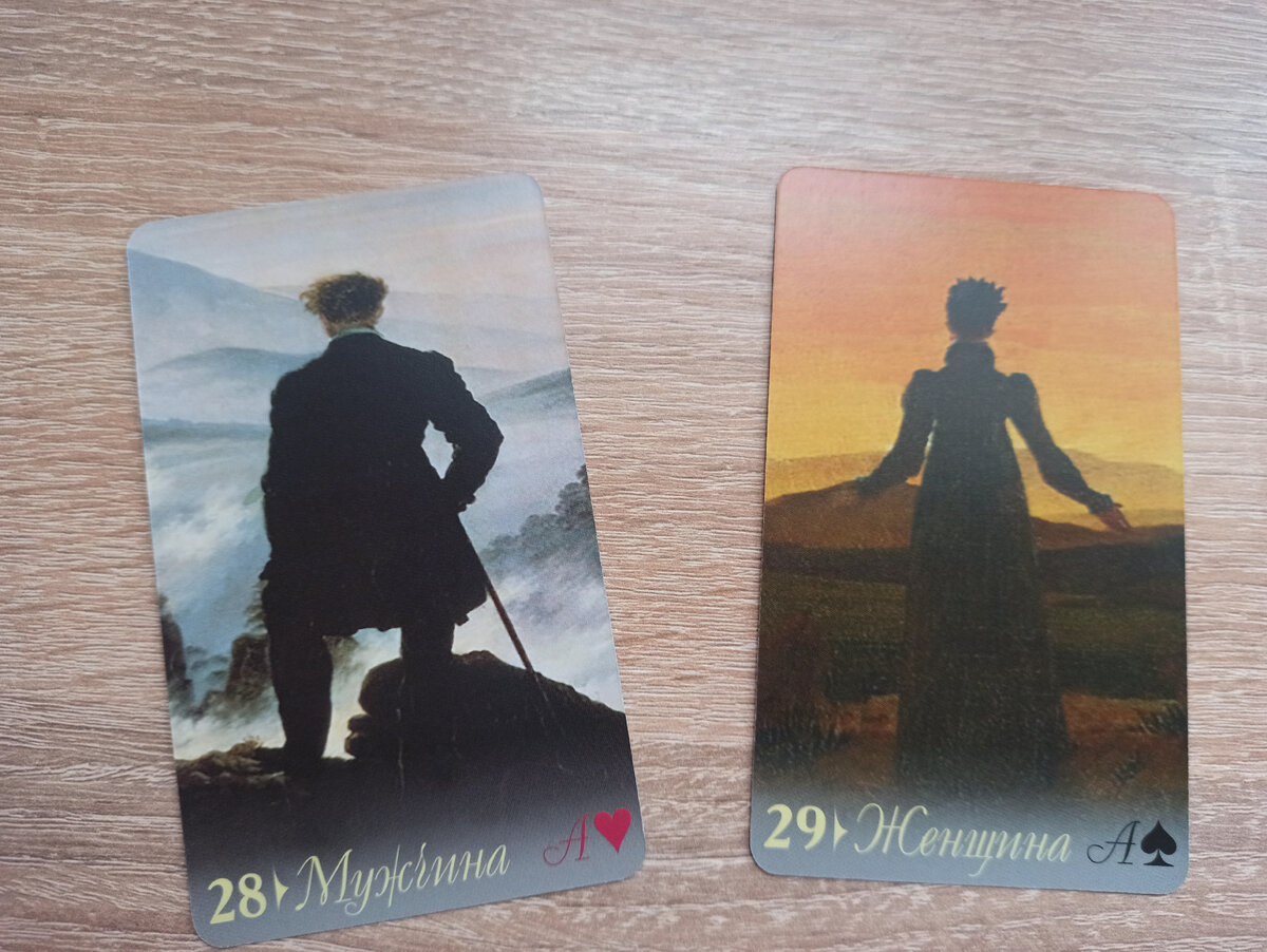 Здравствуйте! Привлекла меня новая колода - Оракул Ленорман Арт-Эм - своей неординарностью и отличием от классических Ленорман. Качество изготовление колоды не самое лучшее.. но формат карт удобен, подобранные образы любопытны и своеобразны.. колода будет интересна как для коллекции, так и для работы на ней. При общении с колодой, у меня создаётся впечатление - прогулки по выставке или чтение классического произведения.. Что мне нравится в этой колоде: Первое - это карты Мужчина и Женщина. Фигуры, изображённые на картах статичны, у них нет "взгляда карты" - поэтому можно не загадывать, где будущее - по взгляду карты или справа.. справа - будет всегда - не ошибаетесь. Мужчина и Женщина очень хорошо изображены - из-за спины, их взор устремлён в будущее, прошлое их не интересует.. подобное изображение очень хорошо помогает концентрироваться на вопросах о будущем, глядя на карту бланки.. впечатление, что фигуры остановились лишь на мгновение, чтобы оценить перспективы, подумать, построить