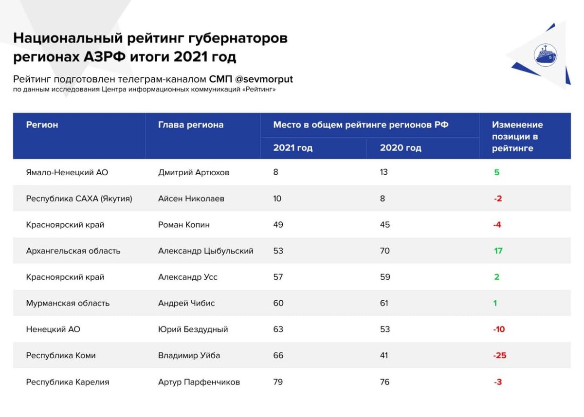 «ЦИК Рейтинг» выпустил итоговое исследование, посвященное губернаторскому корпусу за 2021 год. По его итогам среди глав АЗРФ сильнейшим признан Дмитрий Артюхов, возглавляющий Ямал, который на протяжении всего года не покидал группу отличников. Самые слабые позиции — у Артура Парфенчикова из Карелии.