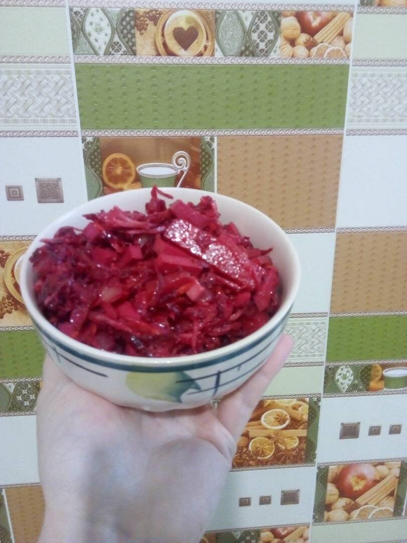 #святковеменю Варіанти приготування цього салату різноманітні,проте він є смачним,ситним та різнобарвним Ингредиенты: вареної ковбаси, вареного буряка, середня морквина, цибулина, Капуста свіжа (брала квашену) , картоплини, Сіль,перець, олія Способ приготовления: Ковбасу порізати соломкою, моркву,буряк на тертку. Картоплю почистити, обсмажити соломкою,цибулю теж злегка обсмажити. Додати капусту,можна свіжу, хоча я беру квашену,так смачніше. Додати сіль,перець,олію або майонез.