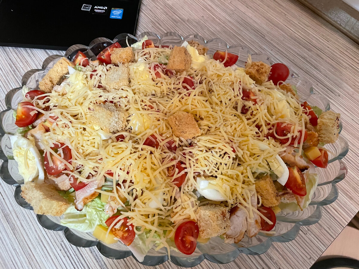 Дорогие друзья, сегодня мы будем с вами готовить классический вариант Цезаря)) Этот салат - украшение любого праздника! Он уже давно завоевал свою популярность в мире) Запоминаем рецепт, а лучше записываем! Для приготовления нам понадобятся следующие ингредиенты: Приступим к приготовлению Шаг 1 - Приготовим сухарики. Срезаем с хлеба корочку, мякиш нарезаем кубиками. Выкладываем кубики на противень, застеленный пергаментной бумагой, солим, посыпаем паприкой и ставим в разогретую до 160. Шаг 2. Филе куриное промываем, просушиваем бумажными полотенцами, натираем солью, паприкой и растительным маслом с двух сторон. Обжариваем на хорошо разогретой сковороде около 5 минут на каждой стороне. Шаг 3. Промываем листья пекинской капусты, просушиваем, режем на небольшие кусочки и выкладываем на блюдо. Поливаем соусом. Шаг 4. Режем наше филе на кусочки, выкладываем следующим слоем, добавляем сверху получившиеся сухарики и снова поливаем немного соусом. Сверху выкладываем оставшиеся листья
