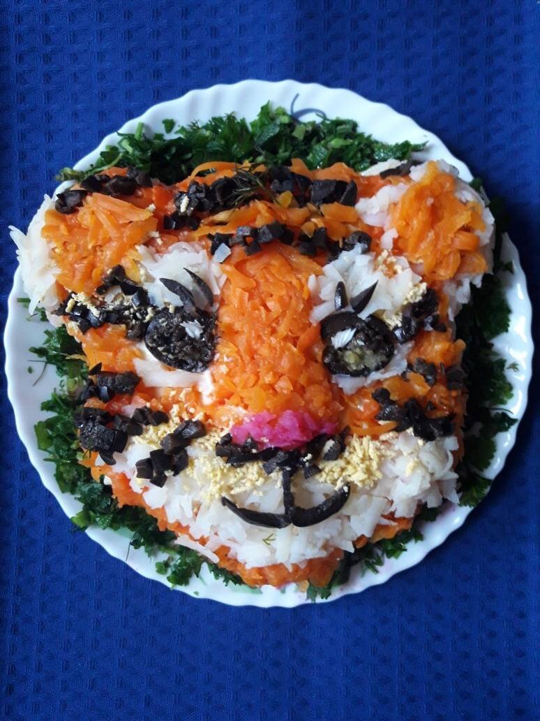 С Новым Годом! Ингредиенты: картофеля, свеклы, моркови, филе селедки, луковица, яйца, майонеза, Оливки для украшения Способ приготовления: Отварить овощи до готовности. Охладить. Почистить. Натереть на тёрке. Каждый овощ в отдельную тарелку. Так будет легче вылаживать слои салата. Сварить яйца. Очистить. Натереть на тёрке в тарелку. Лук почистить, мелко нарезать и замариновать. Взять тарелку, смазать майонезом по контуру головы тигра. Потом выложить слои: картошка, майонез, свекла, майонез, яйца, лук, кусочки селедки, морковь. Украсить используя оливки, тертый картофель, желтки. Приятного аппетита!