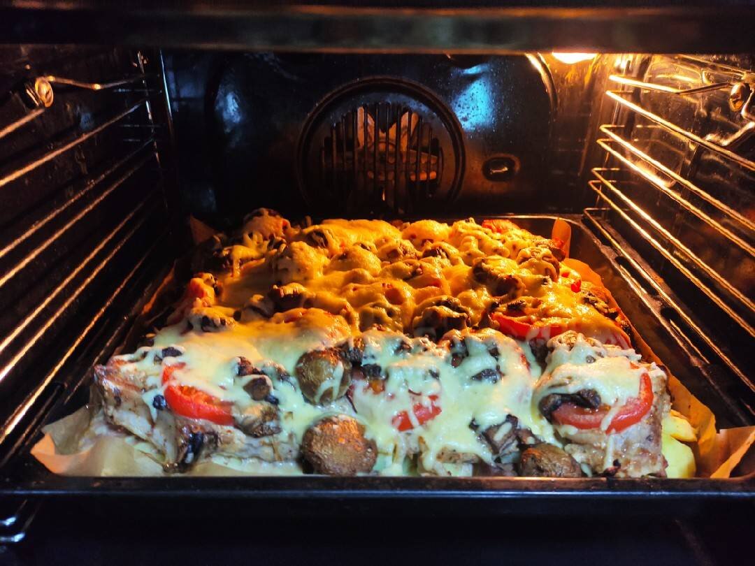 Свиные стейки с картошкой, грибами и помидорами в духовке