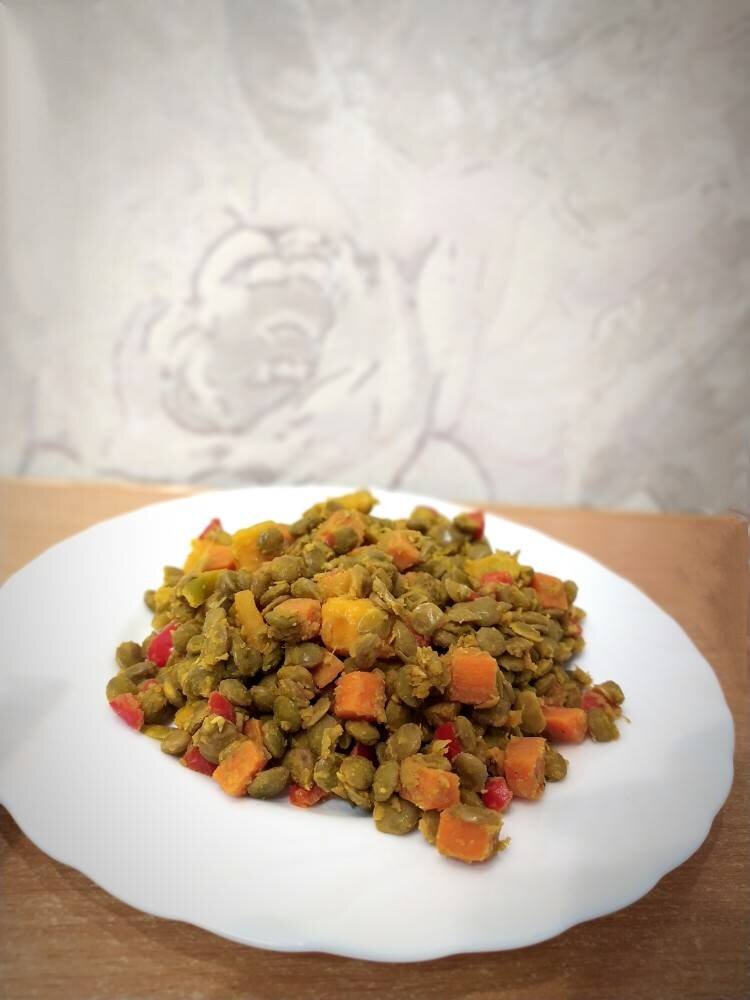 #веган Очень необычное, но очень вкусное блюдо. Сладкие кусочки манго очень хорошо сочетаются с остальными ингредиентами. Готовила данное блюдо уже несколько раз. Думаю, и Вам оно понравится! Ингредиенты: ст (1 ст = 250 мл) зелёная чечевица, болгарский перец (небольшой), морковь (маленькая), свежий или 50 г сушёный манго, Корень имбиря (немного), ч.л красная паприка, ч.л куркума, Чёрный перец по вкусу, Соль по вкусу, ст.л сок лимона, ст.л растительное масло, ст вода Способ приготовления: Зелёную чечевицу промыть и замочить на ночь (8-12 ч). Я убираю в холодильник. Отварить чечевицу в воде до готовности. На 1/2 ст сырой чечевицы у меня ушло 1,5 ст горячей воды. Если чечевица уже готова, а вода осталась, слейте лишнюю воду. Свежий манго я ни разу не пробовала использовать в этом рецепте, всегда использовала сушёный. Если у Вас свежий - очистите его и нарежьте кубиками. Если сушёный, то тоже нарежьте и залейте кипятком на 5 мин. Тогда манго станет мягким, и на вкус как свежий. Слейте воду
