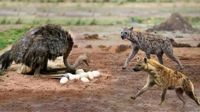 Как поступают африканские страусы, если им не повезло столкнуться с голодными гиенами.