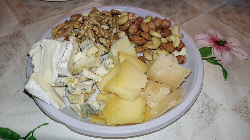 Камамбер лучше брать с конечным сроком годности. Так корочка толще, а структура сыра мягкая и текучая. Впрочем все на любителя. Я беру марку president. Сыр твердый выдержанный у меня Олд Граф, он с запахом. С голубой плесенью подойдёт любой ДорБлю. И из твердых сортов можно взять на ваш вкус, у меня Алтайский.