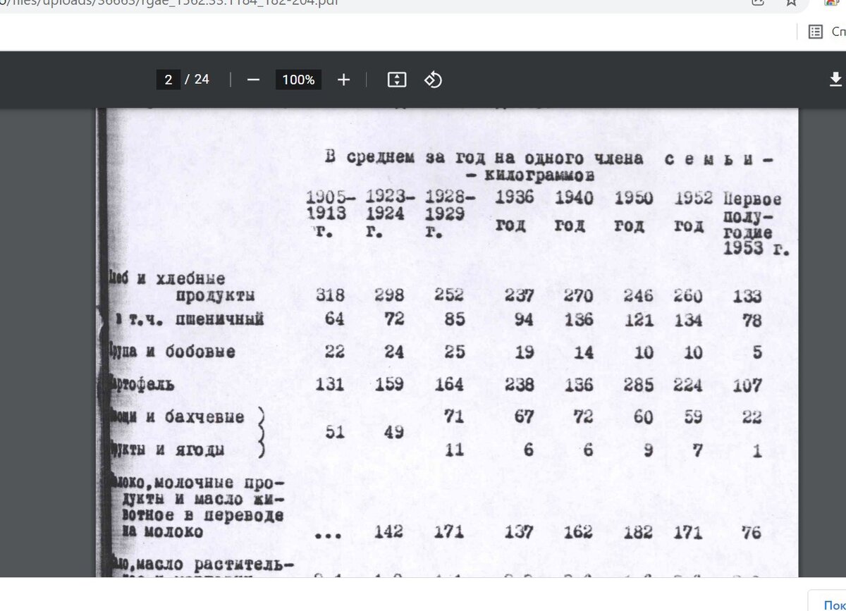 Итак, как следует из таблицы динамика потребления основных продуктов представлена в таком порядке: Пик экономического развития Российской империи 1905-1913, пик НЭПа 1923-1924, начало коллективизации 1928-1929, затем идет 1936 год, когда колхозная система в общем устоялась, колхозникам разрешили иметь частные подворья, узаконили колхозные рынки, а в городах отменили карточную систему, затем последний предвоенный год, 1940 (довольно урожайный) и 1950, 1952 и первое полугодье 1953. В список основных продуктов вошли: Хлеб и хлебные изделия, крупы и бобовые, молочные продукты, картофель, овощи, фрукты и бахчевые, а также ягоды (1 категория) мясо, сало и животные жиры, яйца и сахар.