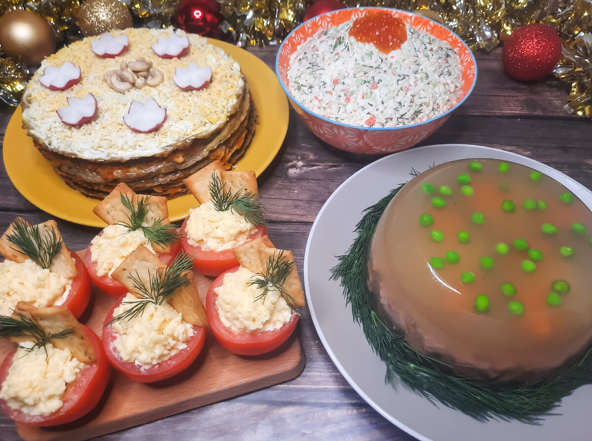 Сегодня я предлагаю читателям мой вариант классического новогоднего меню с холодцом, оливье, печенью трески и другими традиционными угощениями.