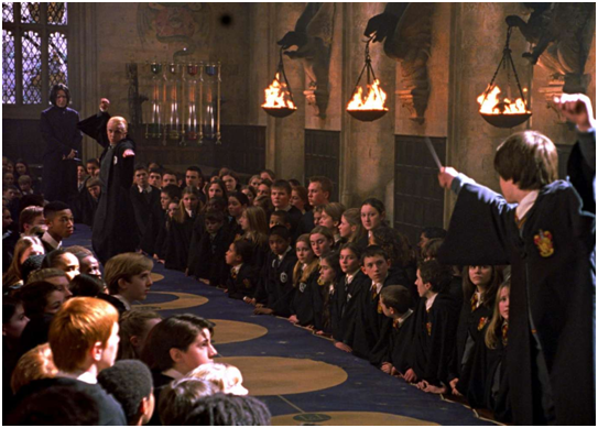 Как только закончился обед, от стола пуффендуйцев осталось тёмное облако, а вместо него возник деревянный помост, длиной не менее 60 – 70 футов (1 фут = 30.48 см). Златопус облачился в форму фехтовальщиков, взошёл на помост и, прохаживаясь по нему, сказал: