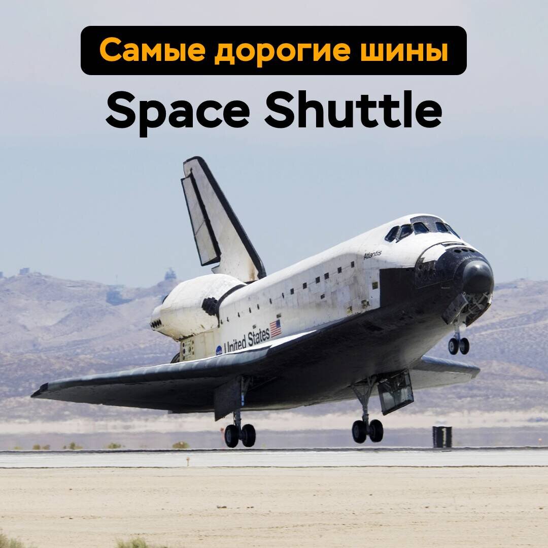 Космос! Несмотря на то, что колёса луноходов шинами не назвать при всём желании, всё же есть техника, которая эксплуатировала шины в классическом виде к которому мы привыкли. Space Shuttle — это многоразовый космический корабль, который возвращался на землю путём классического приземления как самолёт. При этом зафиксированное пребывание в космосе от 2-х до 17-ти суток. Всего за 30 лет эксплуатации пять шаттлов совершили 135 полётов в космос. В 2011 году был проведён последний полёт шаттла в рамках программы «космической транспортной системы». Посадка — это сложнейший процесс с несколькими этапами гашения скорости и выравниванием корабля. Финальная стадия проходит на высоте 500 м и скорости около 430 км/ч: начинается выравнивание корабля и производится выпуск шасси. Касание полосы происходит на скорости порядка 350 км/ч, после чего выпускается тормозной парашют диаметром 12 м. После торможения до скорости 110 км/ч парашют сбрасывается.