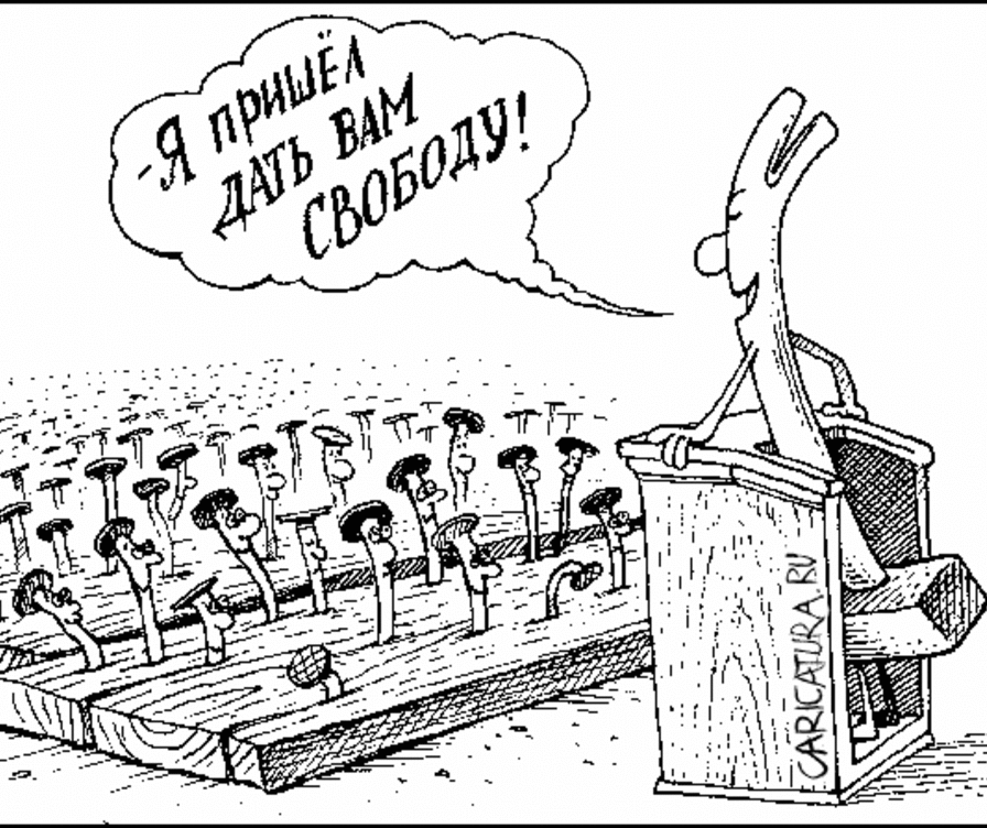 Что же так упорно не могут понять в русском народе современные борцы за власть. Они все борются, борются за свободу русского человека, а неблагодарный русский не хочет свергать "ужасную власть". Более того, иногда он даже соглашается с некоторой критикой, иногда видит факты, которые ему не нравится, но все равно в итоге не идёт на действие. Стандартный ответ - это инфантилизм, русский человек - раб по природе. Возможно так, но мне кажется картина "Я Дартаньян - а остальные .." поверхностна. Основная ошибка в понимании свободы. Фраза "боритесь за свою свободу" вызывает в русском человеке экзистенциальный диссонанс - он прямо не понимает что от него требуется, зачастую он даже сам себе не может объяснить, а тем более борцам. Почему то он находится в недоумении от этой фразы, но чувствует, что недоумевать в данном случае - единственная адекватная реакция. Я не могу отвечать от имени народа, но могу строить догадки, и вот в чем проблема данного "непонимания": Если за свободу надо боротьс