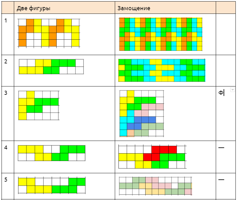 Придумайте как можно больше замощений плоскости 5-червячком. Решение: Мы решили рассмотреть возможные способы расстановки двух червячков относительно друг друга. В таблице ниже представлены найденные нами варианты расстановки двух фигур и соответствующие им замощения. В третьем столбце знаком “ — “ отмечены те варианты, которые дают “дырчатые” замощения, то есть не подходят под условие задачи.