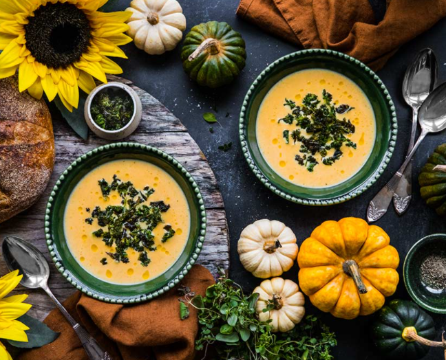 Суп из тыквы и моркови с чипсами из капусты и лимона