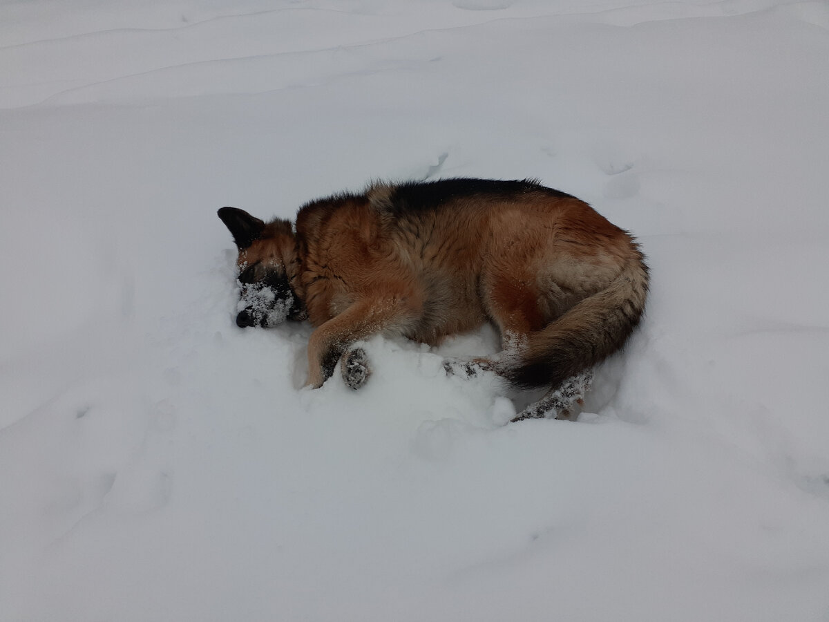 Собака Кира зиму любит, в теплой шубе ей не холодно. Уляжется Кира на снег и отдыхает. Может даже задремать :) Холод лучше, чем жара :) Проверила свою норку. Станет очень холодно - дом есть :) Сломанная сосна на знакомой тропинке. Жалко, такая сосна высокая, стройная. Упала между двумя деревьями. Сосны высокие, хрупкие. Снега много, во время оттепели он становится тяжелым, в морозы замерзает. Такие глыбы наверху... Идем домой. Зима снежная в этом году. На снегу хорошо, а на коврике лучше :) Когда надоел фотограф... :)