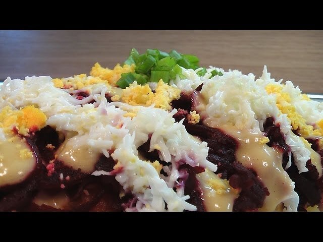 Отвариваем в мундире картофель, морковь и свеклу, очищаем и натираем на терке. Натираем сваренные вкрутую яйца. Нарезаем лук и маринуем его уксусом и сахаром. Нарезаем сельдь. Укладываем все ингредиенты послойно на блюдо, между слоями покрываем майонезом. Перед подачей на стол минут 40 даем постоять в холодильнике.